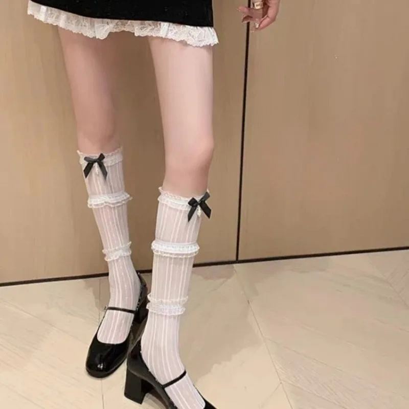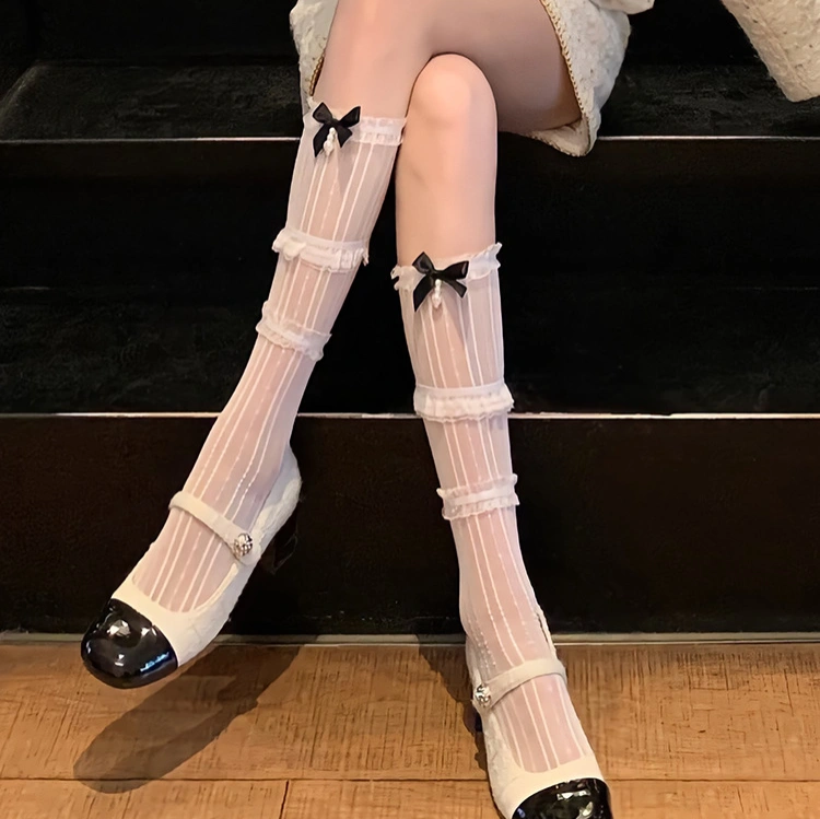 Black ribbon bow lace socks