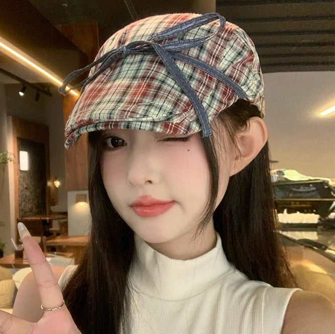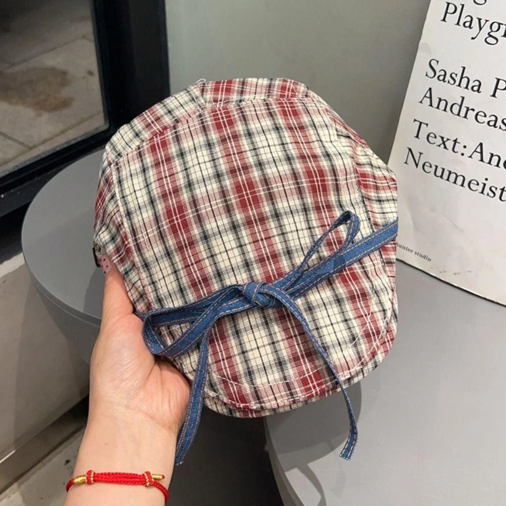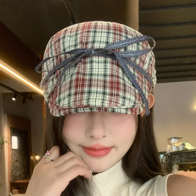 Bow red plaid versatile hat