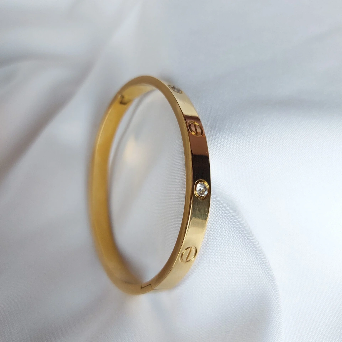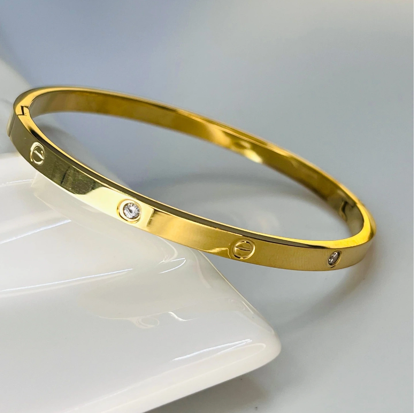 Bring a piece of iconic luxury into your everyday wardrobe with the Rangritiya Love Bracelet. Inspired by the world-renowned French design, this bracelet features a polished stainless steel body with delicate screw-head motifs and sparkling cubic zirconia stones that emulate diamonds — all while keeping it light, affordable, and suitable for daily wear. This 18 cm version (approx. 2.4 Indian bangle size) offers a snug fit for slender wrists, making it a must-have for anyone who loves minimalist, elegant jewelry. The Rangritiya Love Bracelet is thoughtfully designed to reflect luxury without compromise. With its iconic screw-pattern detailing and inlaid Cubic Zirconia stones, this bracelet mirrors the timeless elegance of high-end designer styles, offering a sleek and modern edge that fits every occasion — from everyday errands to elegant dinner dates. Made from high-quality stainless steel, this bracelet is not only beautiful but also highly durable. It is rustproof, tarnish-resistant, and hypoallergenic, making it perfect for sensitive skin and long-lasting wear. You can wear it daily without worrying about fading, irritation, or losing its luster. This bracelet is sized at 18 cm inner circumference (approximately 2.4 Indian bangle size), ideal for wrist sizes around 6.5 to 6.8 inches. It offers a snug, secure fit that feels comfortable even during long hours of wear. Its gold metallic finish provides a touch of femininity and sophistication, perfect for pairing with Western outfits, ethnic wear, or even a smartwatch stack. Whether you wear it alone or layer it with other bracelets, it stands out beautifully without overpowering your look