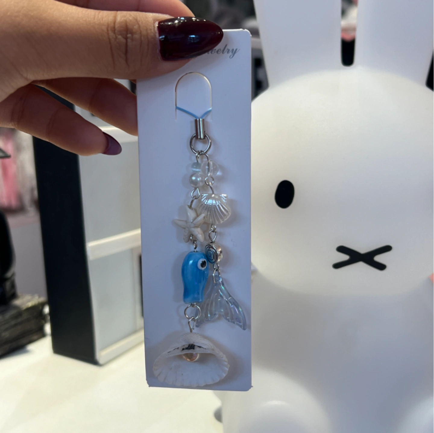 ocean-themed keychain or bag charm featuring shells, a starfish, and a blue fish bead