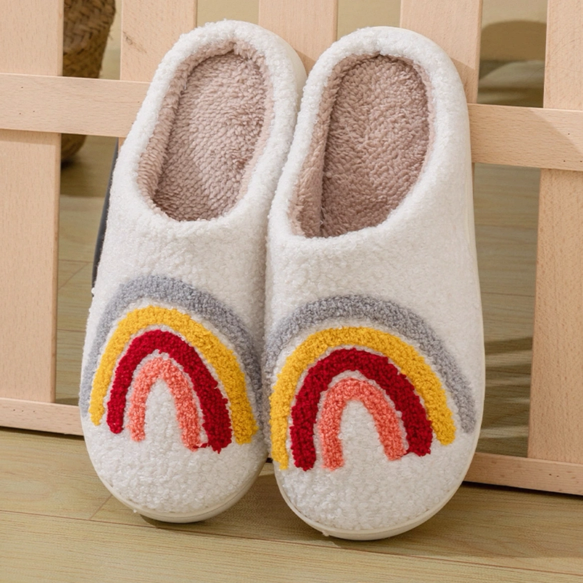 A cozy treat for your feet Step up your relaxation game with these rainbow slippers. These wrap your feet in a cozy hug of plush warmth and splash them with a vibrant rainbow of colors. They’re the perfect touch of whimsy to brighten your loungewear.Flexibility for every stepThe flexible, non-slip rubber sole adds stability to every step, making these cozy slippers not just a treat for your feet, but a stylish companion for confident, steady strides.Your go-to slippers for any dayWhether you're unwinding at home or staying warm on a chilly day, these plush slippers are your go-to for cozy comfort and effortless style. Slip them on and let your feet enjoy the perfect blend of warmth and flair!Product Details Pattern: RainbowType: Slip-onSeason: All seasonSole Material: RubberSize & FitFit T